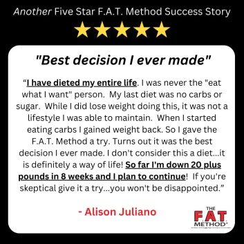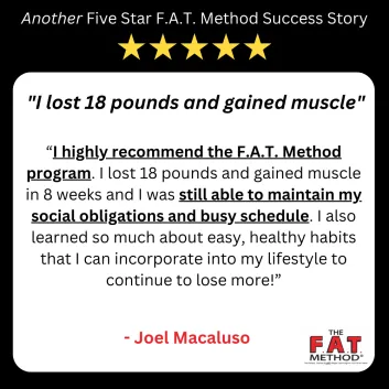 No more yo-yo'ing! The F.A.T. Method is the epitome of sustainability – a simple, healthy approach that you can seamlessly integrate into your life. Not only will you achieve your desired weight, but you'll also look and feel great, radiating confidence and vitality.